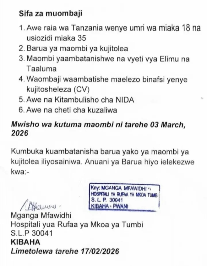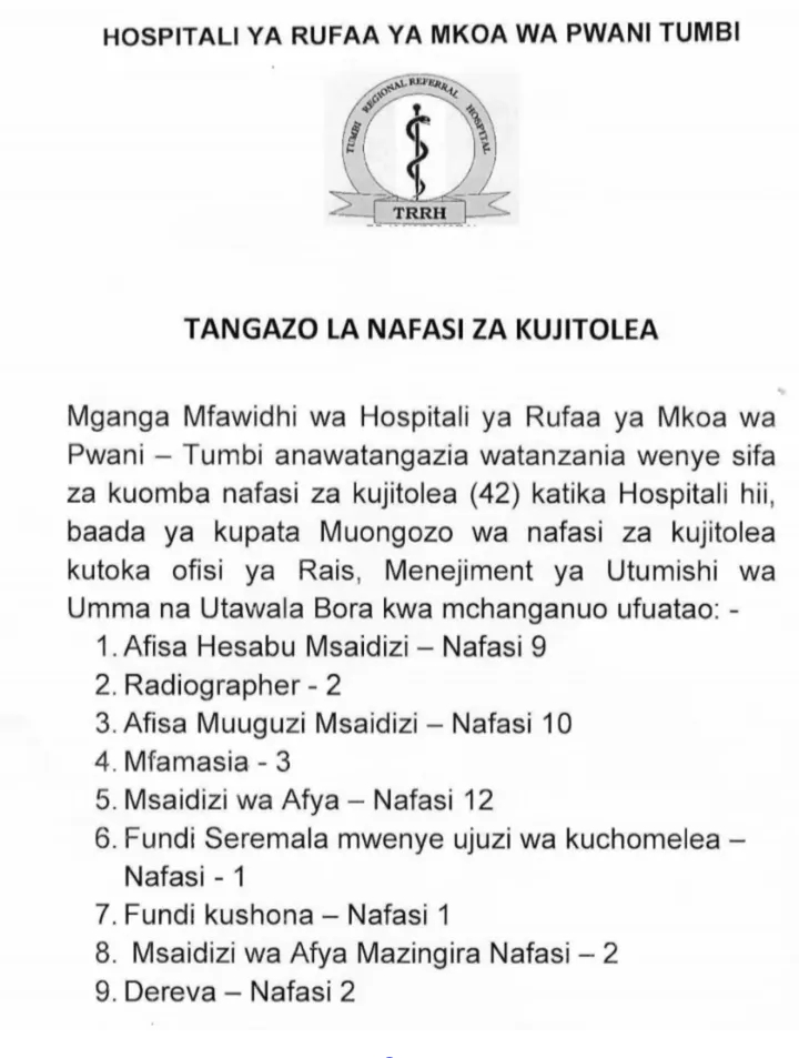 The Medical Officer In-Charge of Pwani Regional Referral Hospital – Tumbi invites qualified Tanzanians with integrity and good conduct to apply for 42 volunteer positions at the hospital. This follows approval from the President’s Office – Public Service Management and Good Governance.
